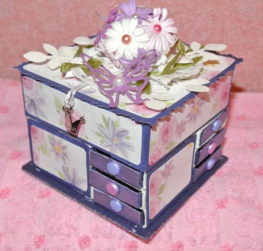 Похожая конструкция, разница лишь в декоре и количестве ящиков на каждой стороне. Для прочности крепления помещаем склеенную шкатулку на картонку и шкатулка готова к использованию.