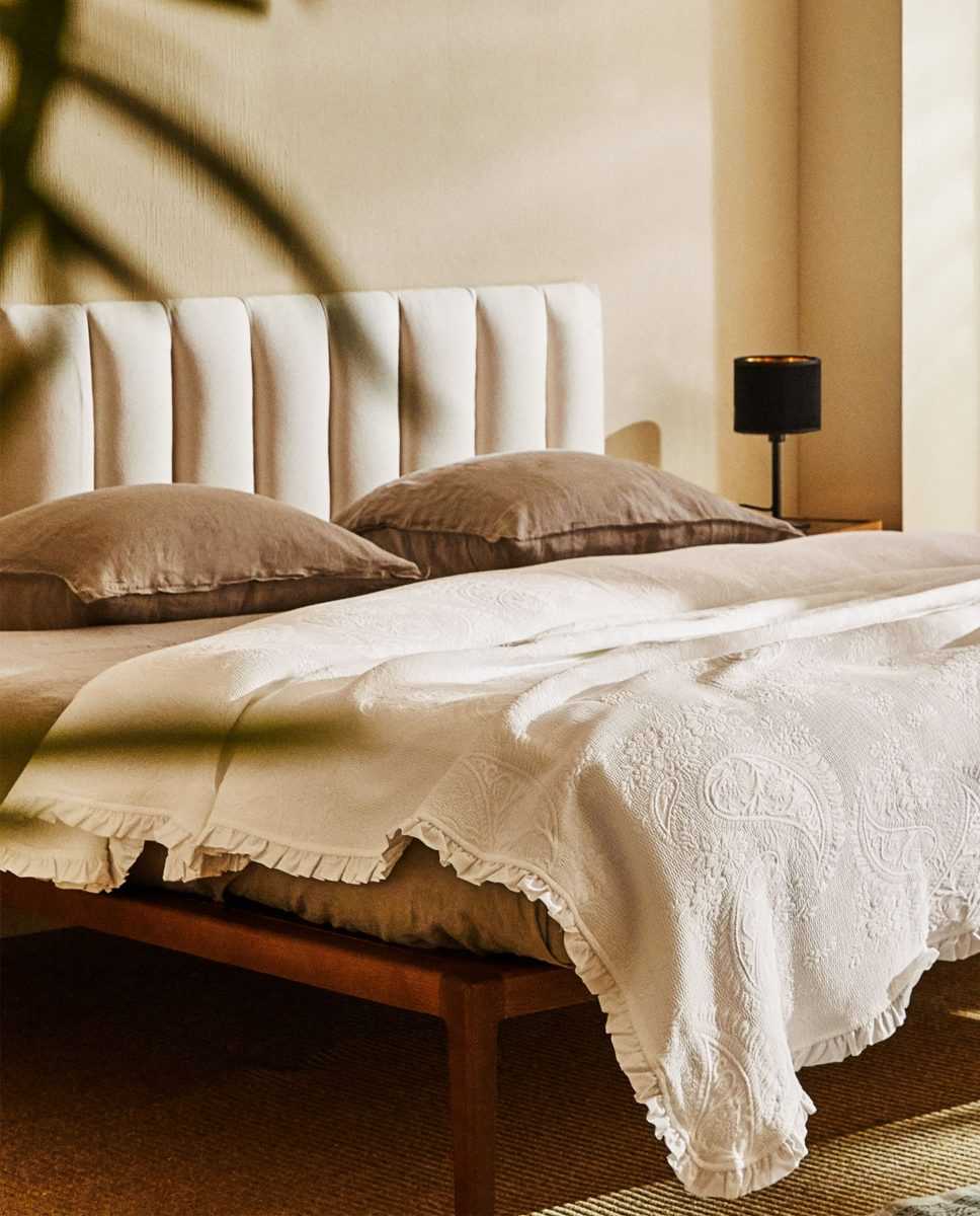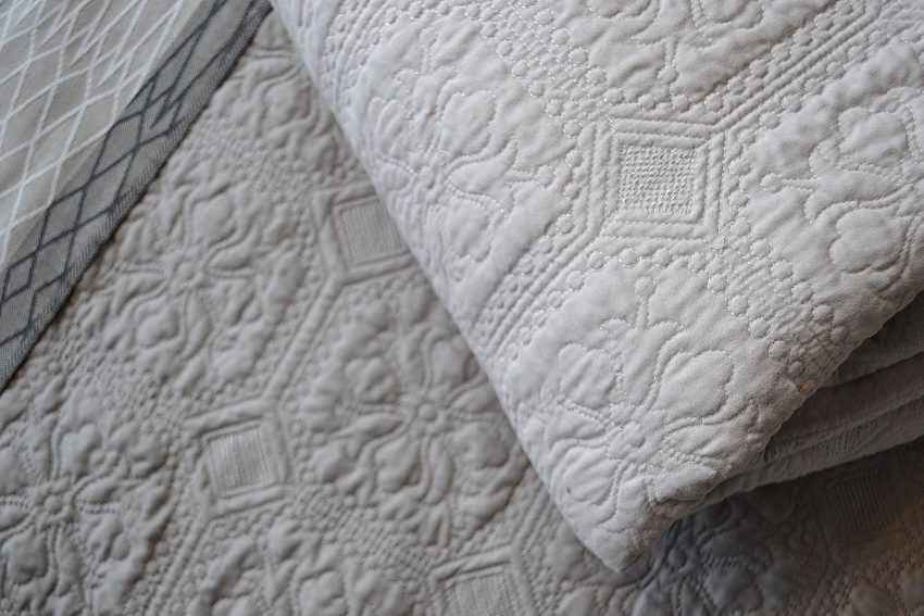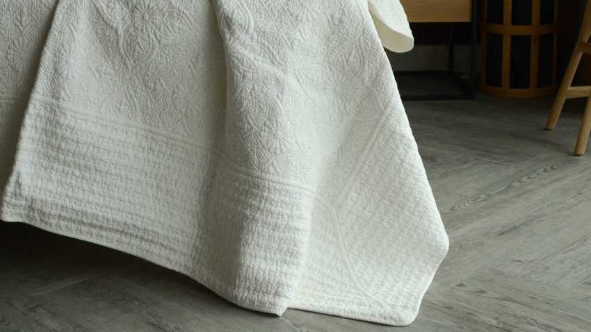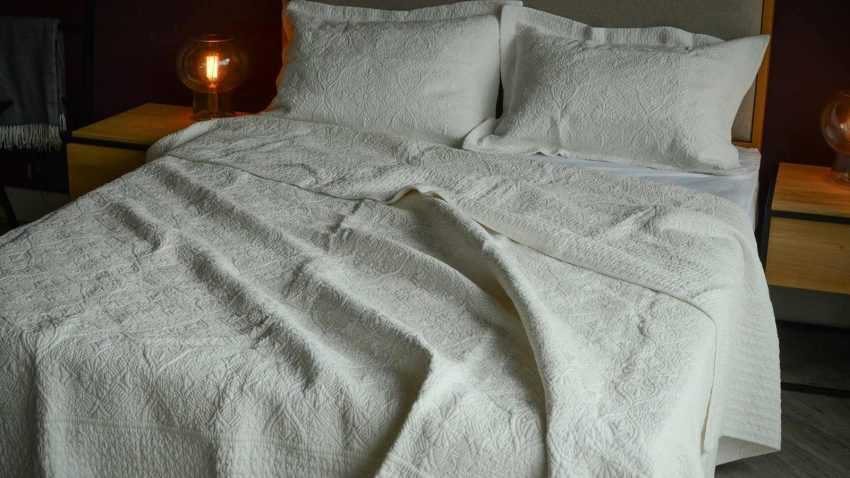 Лен — классический материал для покрывала. Стоит помнить, что он может давать усадку и плохо гладится.