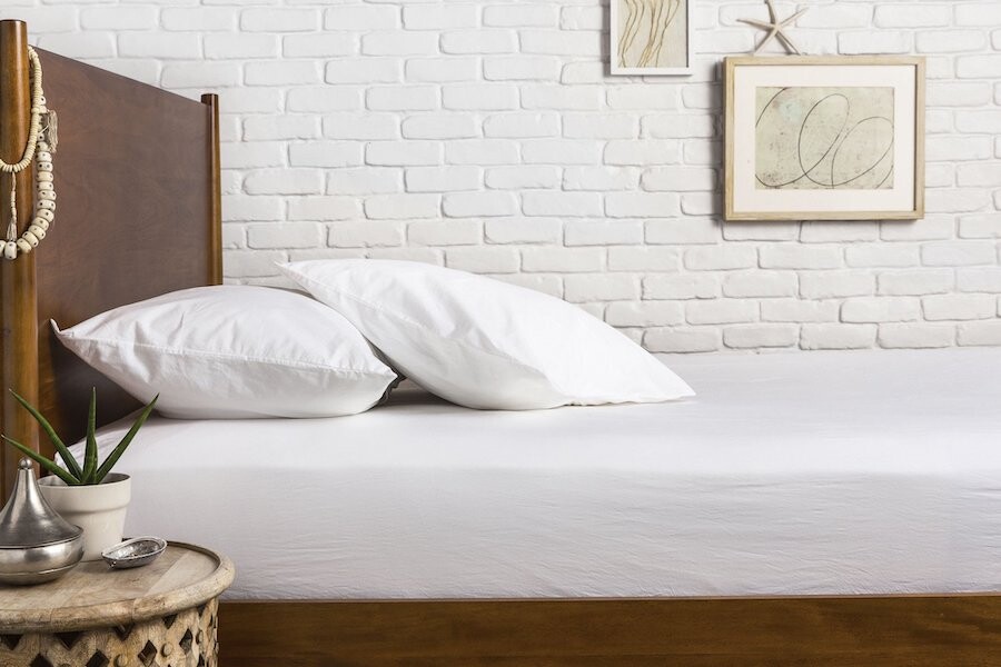 Заправленная под матрас стандартная простыня на кровати