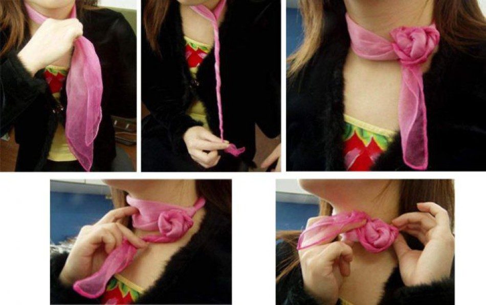 Узел с шифоновым или шелковым шарфом отличается от «розы» с шарфом. Для него нужно на шею повязать платок, он заканчивает первым. Концы скрутите в пучок и сверните пучок в улитку, конец протяните через центр «улитки» с изнаночной стороны. Этот образ подойдет девушке, подчеркнет ее нежность и красивую шею.