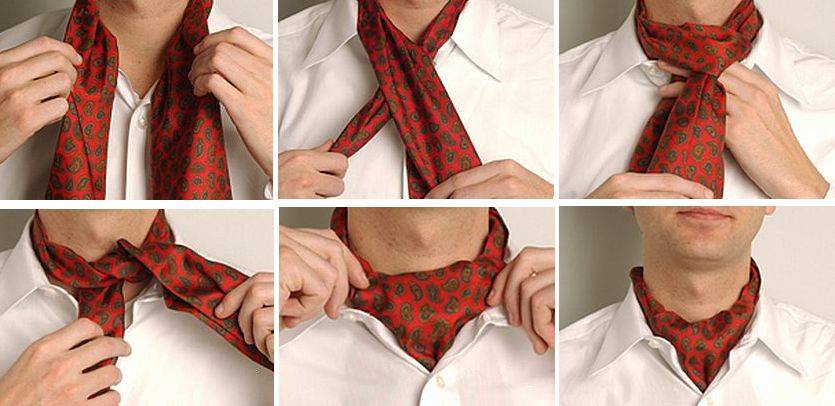 Короткий шарф можно использовать и в мужском гардеробе. Вы можете классическим способом завязать его на шее с помощью специальной булавки. Однако для ношения вам понадобится специальная рубашка с небольшими углами воротника. Оригинально применена методика завершения костюма шарфом — аскот. Такой узел подходит для повседневного стиля.