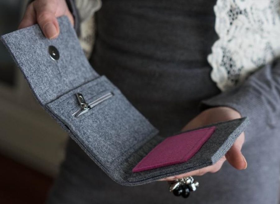 А вот стильный кошелёк из фетра. Можно его сделать таким раскладным, как на фото. В таком случае получится вместить больше кармашков, различных отделений. Ведь так удобно, когда в кошельке можно хранить не только деньги, но и визитки, банковские карточки!