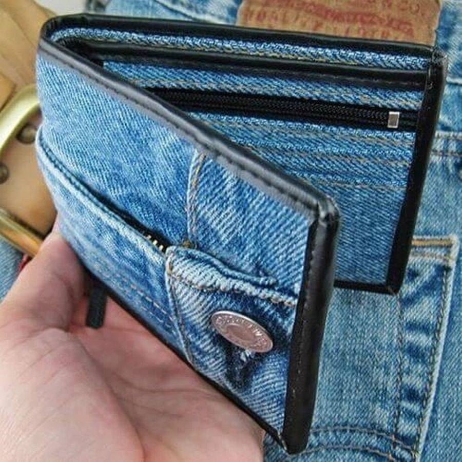 А вот модель для поклонников джинсовой одежды. Кошелёк в таком случае станет гармоничным дополнением ко всему образу в целом. Почему бы не соорудить такой аксессуар из старых джинс?