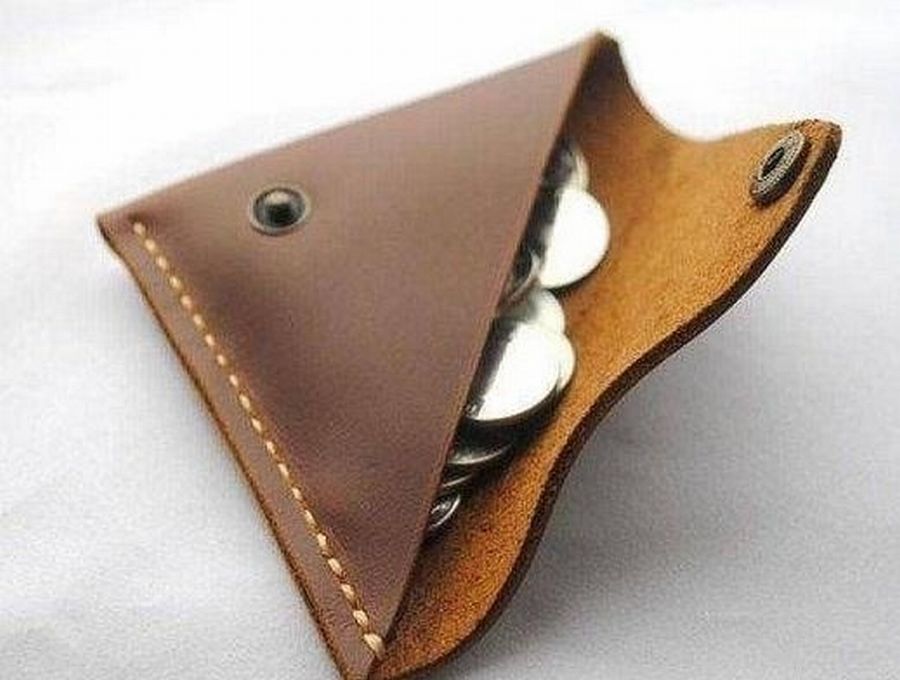 Если в наличии имеется совсем небольшой кусочек материала, можно изготовить вот такой кошелёк-треугольничек. Как раз для тех мужчин, которые не любят носить с собой большое количество наличных денег.