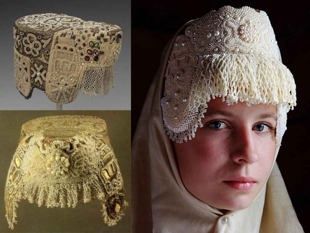Верх делался плоским, а очелье – высоким. Уши прикрывали небольшого размера лопасти, сзади пришивался подзатыльник, лоб закрывался сеткой из нитей, расшитой жемчугом или же бисером.