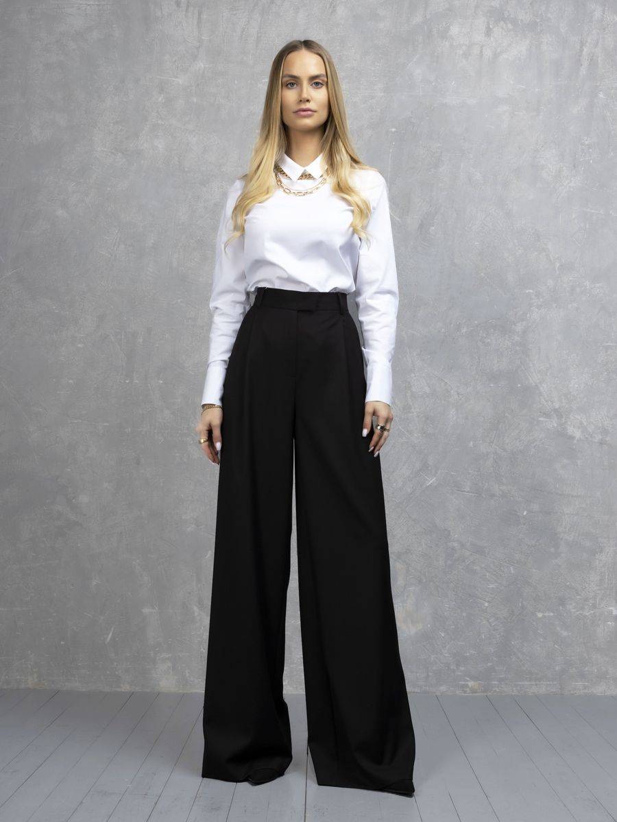 2. Если вы хотите создать более элегантный и формальный образ, сочетайте широкие брюки с блузкой или рубашкой из натуральных тканей, таких как шелк или лен.