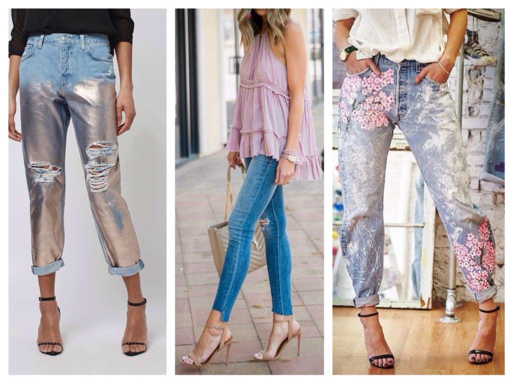 Джинсы с рваным краем с моделями туфель на ремешке