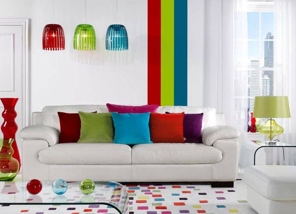 В первом случае стена визуально делится на несколько участков — прямоугольных, круглых, треугольных, квадратных. Далее каждый участок окрашивается в свой цвет.
