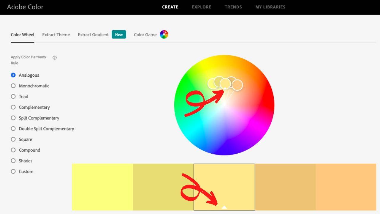 Идем дальше — слева от колеса спектра вы видите все возможные типы палитр (гармоничных сочетаний):