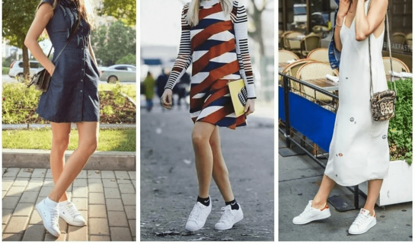 Кроссовки все чаще сочетают с платьями и юбками разных моделей, создавая женственные образы и не жертвуя при этом комфортом.