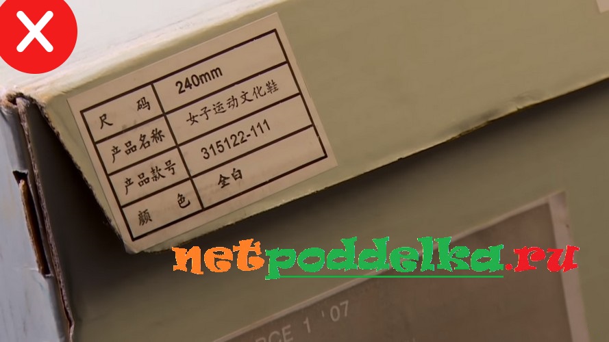 - На наклейке поддельной коробки указан совсем другой цвет обуви – черный, хотя рассматриваемый образец белого цвета.