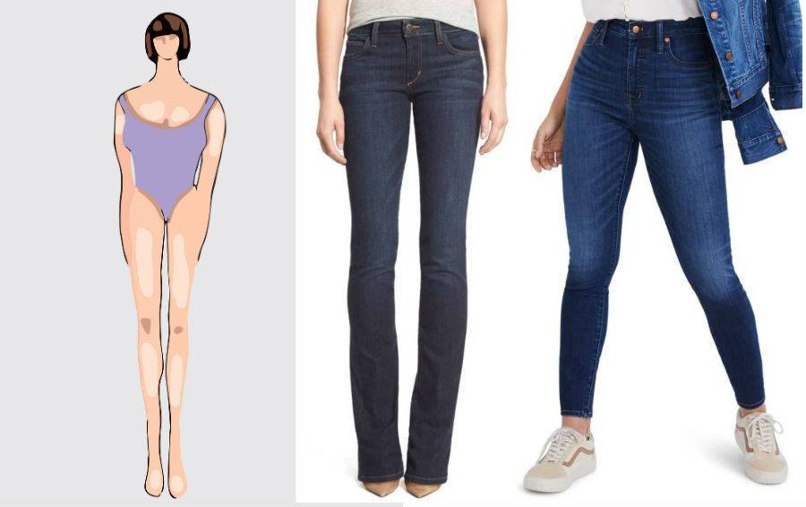 Обычно у обладательниц фигуры прямоугольник длинные ноги, поэтому стилисты советуют подчеркивать их с помощью джинсов скинни, укороченных моделей брюк и джинсов с высокой талией. А вот от брюк с низкой посадкой и джинсов клеш придется отказаться: такие брюки только подчеркнут ваше строение тела.