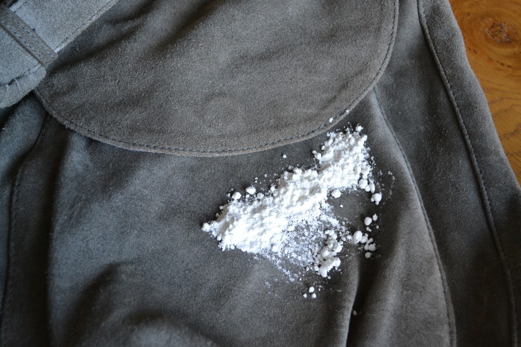 Удобно цветную замшу очищать при помощи абсорбирующих средств. Для этих целей в домашних условиях используют толченый мел, крахмал или тальк. Довольно часто применяют также соду или некрупную морскую соль. Сильно замасленные участки эффективно удаляют компрессы с очищенным бензином.