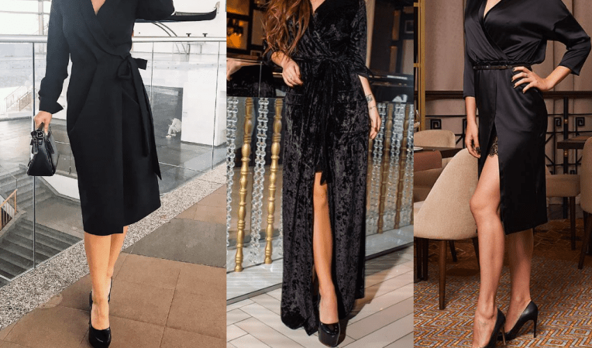 Халат – платье с запахом, которое состоит из свободного лифа и расклешенной юбки. Обязательным элементом является пояс, который завязывается на талии. Такой крой подойдет для любой фигуры, т.к. он отлично подчеркивает линию талии, скрывает лишние килограммы.