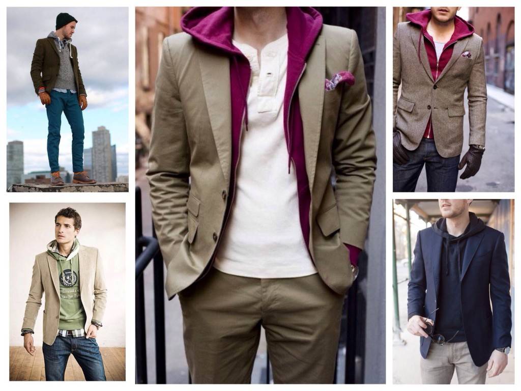 - Сегодня очень модными считаются сочетания толстовки с капюшоном или балахона, жакета и простой футболки. Сначала надевается футболка, затем балахон, а поверх всего этого – блейзер. Капюшон следует аккуратно расправить.
