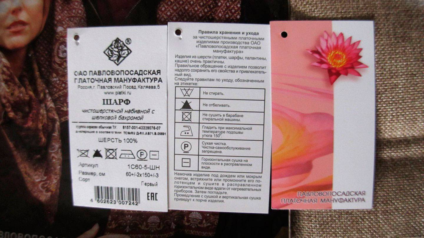 - К каждому изделию производитель обязательно крепит бирку с инструкцией по уходу за изделием, в которой указано, как стирать павлопосадские платки.
