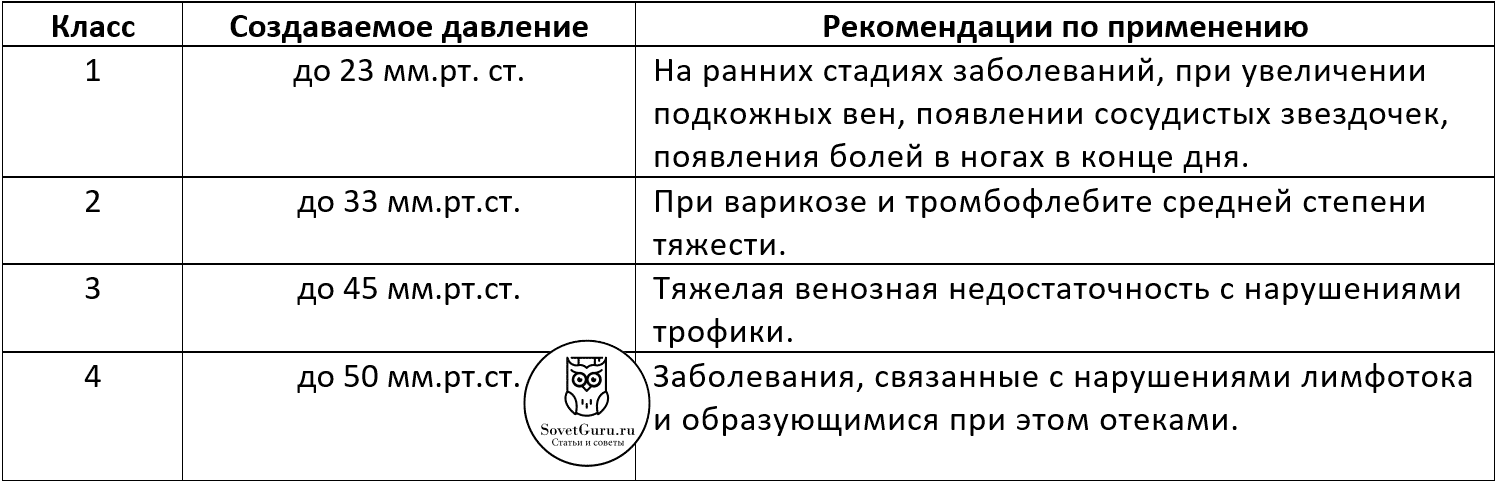 Классы компрессионных изделий и рекомендации по их применению