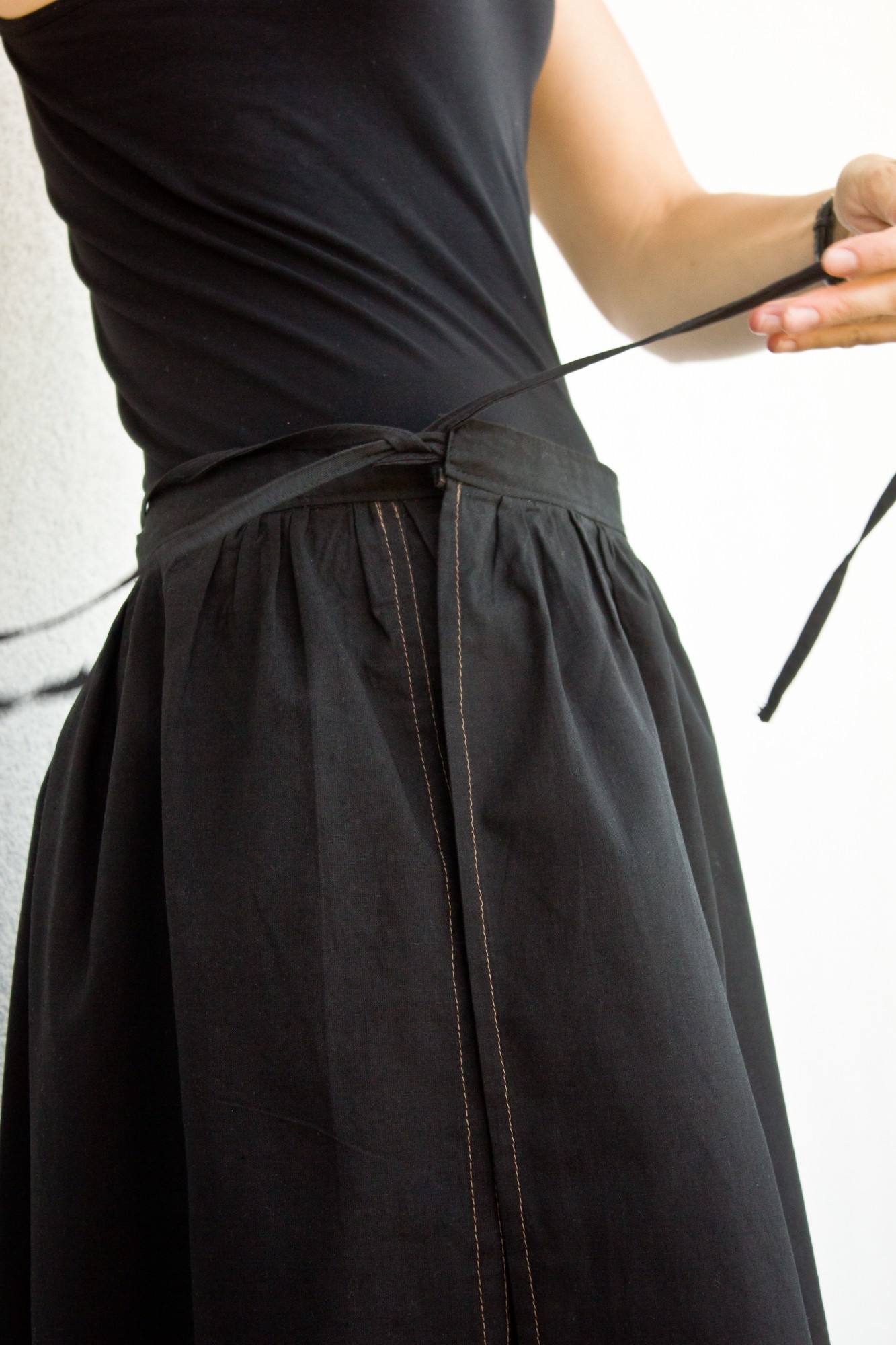 Вставьте завязки в пояс, подогните края и прошейте. Завершающий шаг-обработка нижнего края юбки.