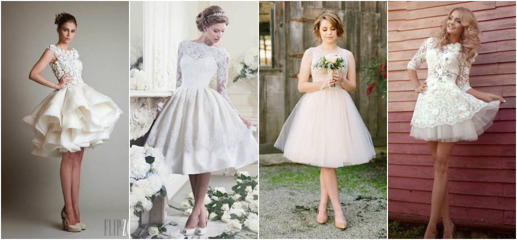 Короткое свадебное платье отлично подойдет низенькой девушке, ведь оно акцентирует внимание на ее хрупкости. Такой фасон откроет изящные ноги, но простой фасон без дополнительных деталей может невыгодно подчеркнуть миниатюрный рост