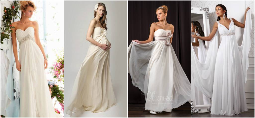 Преимущество данной модели еще в том, что она подходит любому типу фигуры. Более того, очень хорошо этот фасон подходит беременным невестам — завышенная талия хорошо скрывает животик, а легкие материалы и отсутствие пышной юбки не утомляют за целый день.