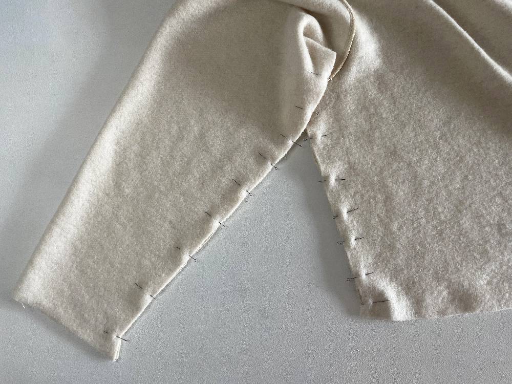 Рукава свитшота принято втачивать в открытую пройму. Вколите или вметайте рукав в пройму, совмещая надсечки, отмеченные на лекалах.
