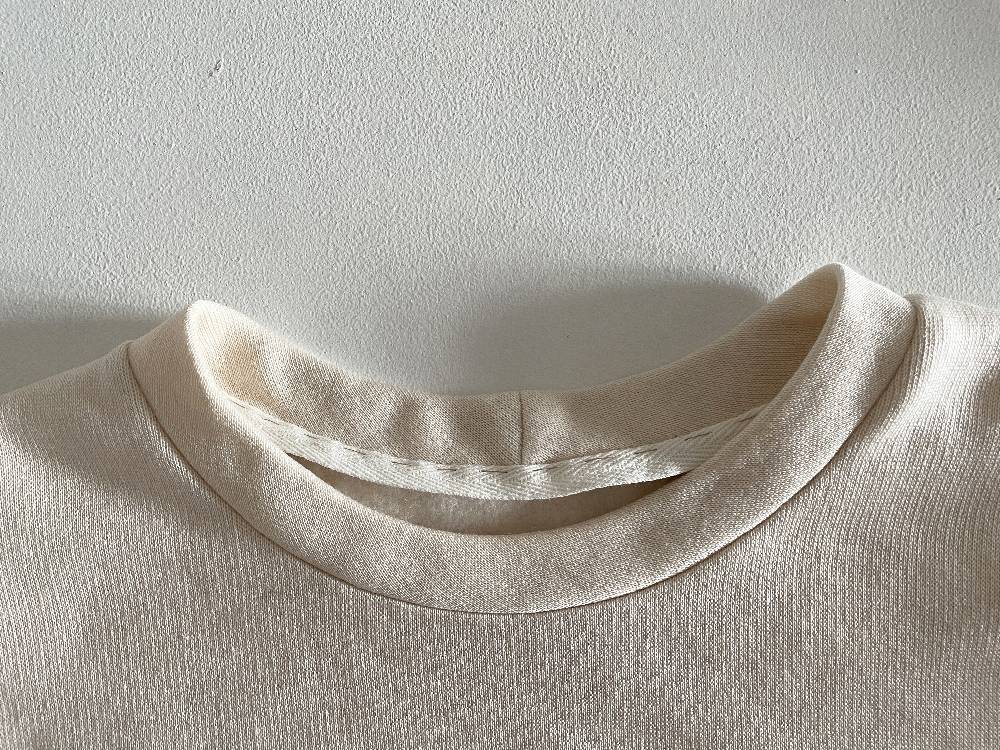 При желании закройте припуск по спинке киперной лентой. Для этого приметайте ленту к припуску и притачайте точно в строчку притачивания бейки или близко к ней.