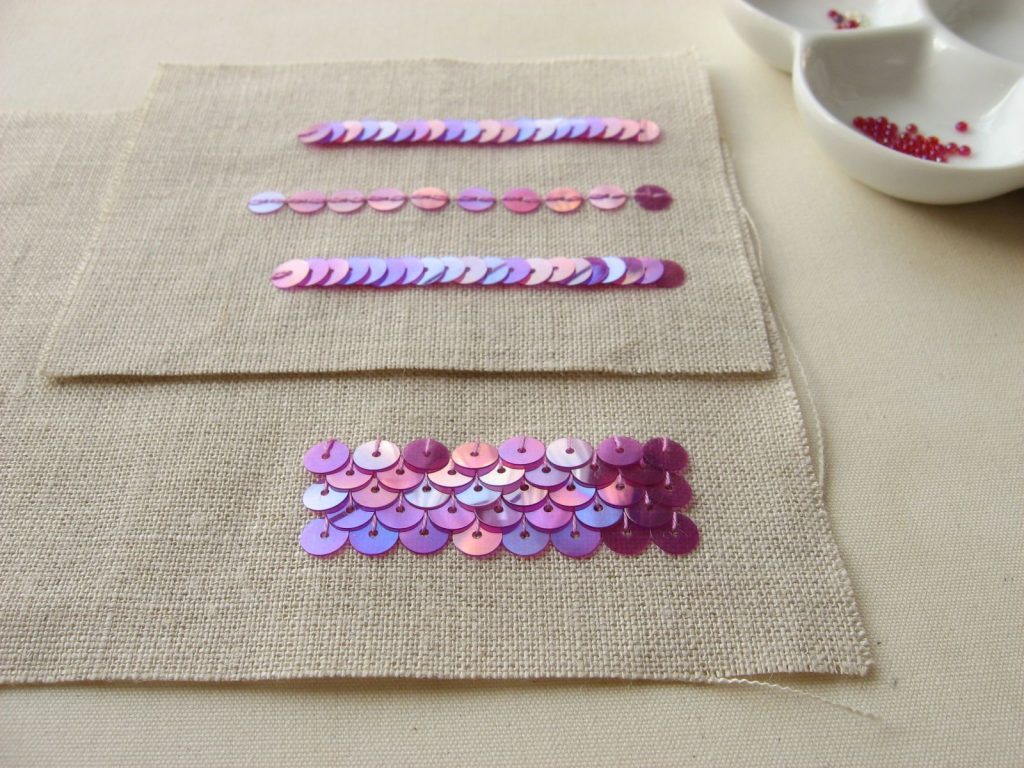 Повторите процедуру нужное количество раз. Эта и другие техники пришивания паеток более подробно представлены в видео уроках, размещенных под статьей.