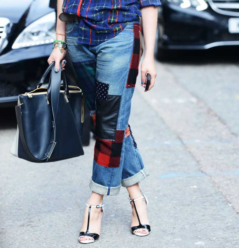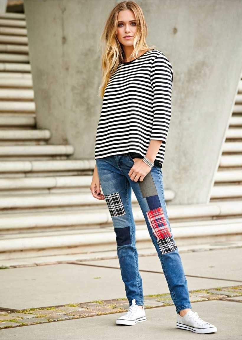 Детские изделия можно украсить яркими, контрастными оттенками латок, а взрослые – более спокойными тонами. Существует несколько способов заделывания потертостей или дырок на коленках. Используют накладные элементы ткани с лицевой стороны, изнаночной, штопку или клеящеюся паутинку. С лицевой стороны срезы латки можно сделать бахромой или подвернуть их и прострочить. Бахрому лучше пришить на подготовленном отрезке или непосредственно на месте обработки штанины. С изнаночной стороны лоскут для аккуратности следует обметать петельным швом.