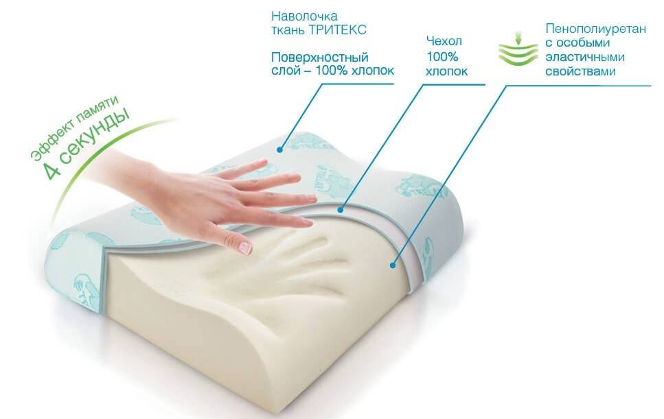 «Эффект памяти» заключается в способности материала долгое время сохранять форму для наиболее удобного положения головы, выравниваясь и принимая первоначальный вид после поворота владельца на другую сторону. Такие ортопедические подушки выполняют из новейших материалов. Например, новинки компании «Трелакс» разрабатывались при сотрудничестве с опытнейшими неврологами и сомнологами, и теперь отличаются особым качеством вязкого полиэстера подстраиваться под владельца.