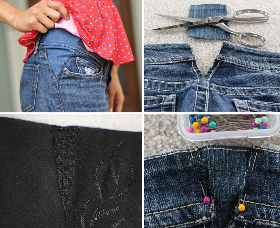 Такой лайфхак поможет в том случае, если штаны стали жать в области талии. Как это сделать: найдите кусочек похожей ткани как на ваших джинсах, вырежьте из нее прямоугольник, затем распорите пояс. Далее вшейте этот кусочек на новое место.