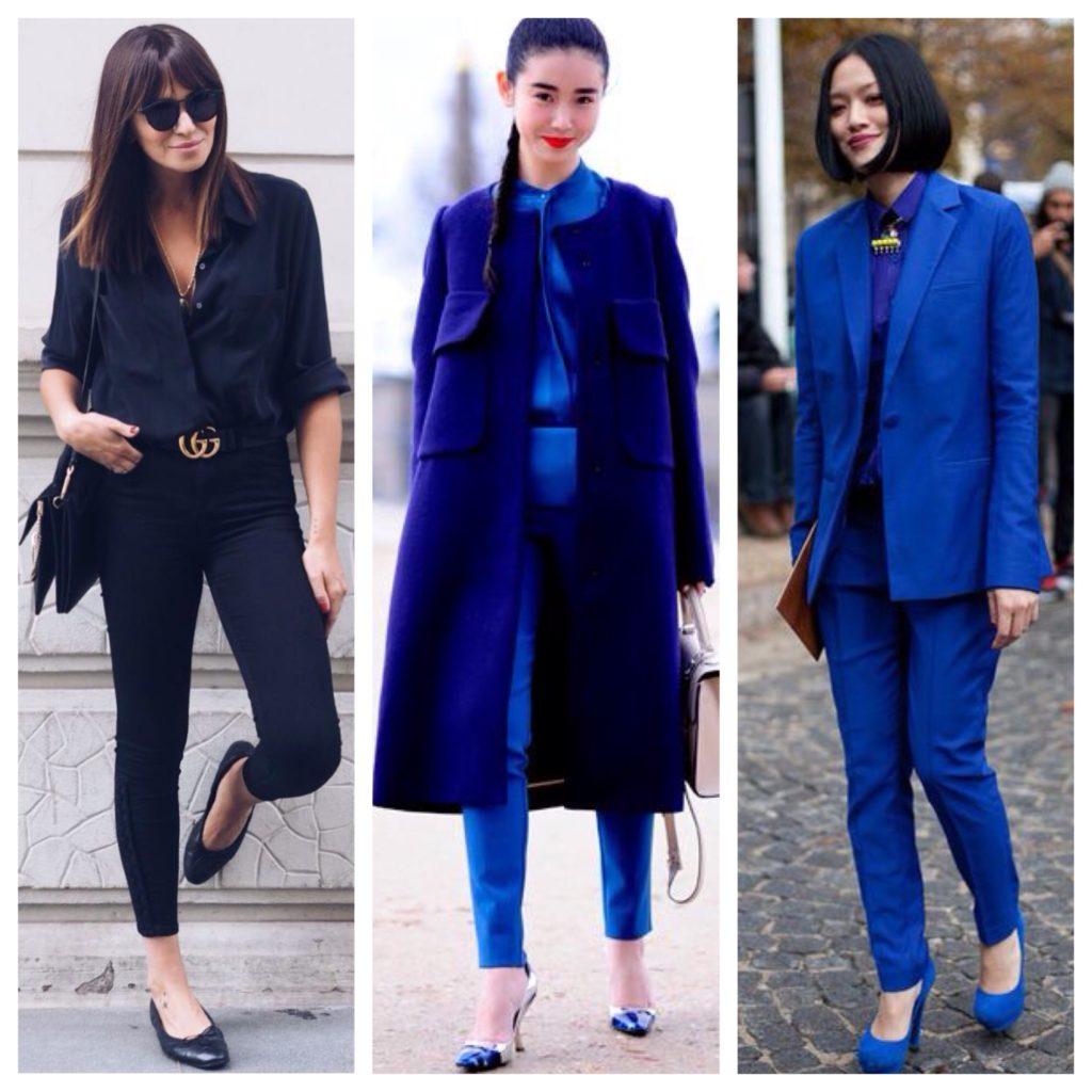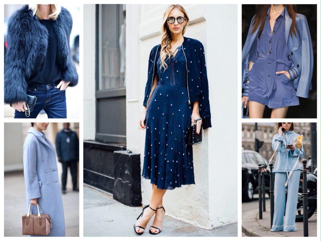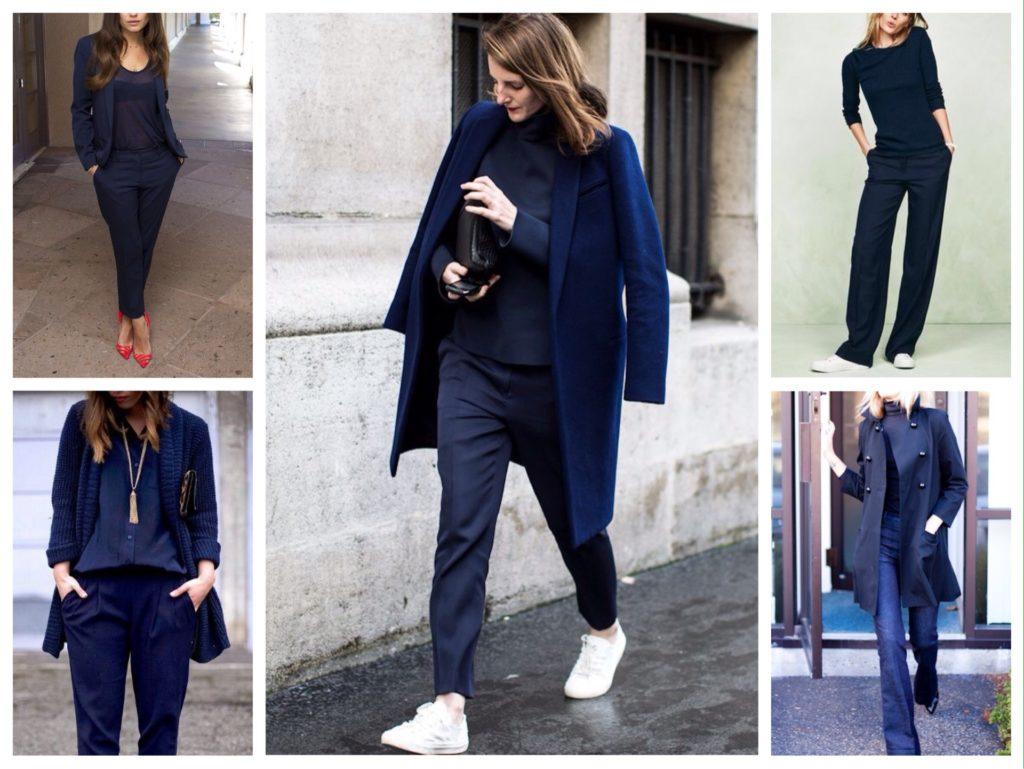 Отличные комплекты можно составить, если тотальным выбрать темно-синий цвет, яркий нэви, припыленный синий и голубой.