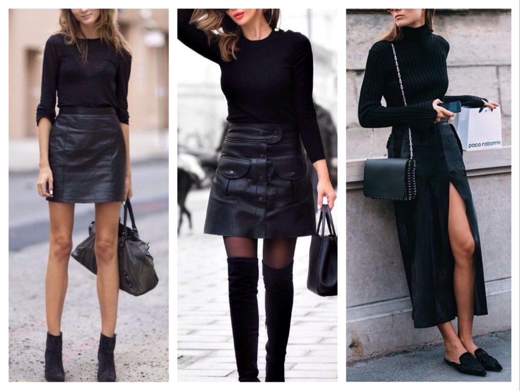 Актуально будет выглядеть узкая серая юбка ниже колен в сочетании с кожаной косухой на несколько тонов темнее. Туфли могут быть как в тон юбке, так и контрастными.