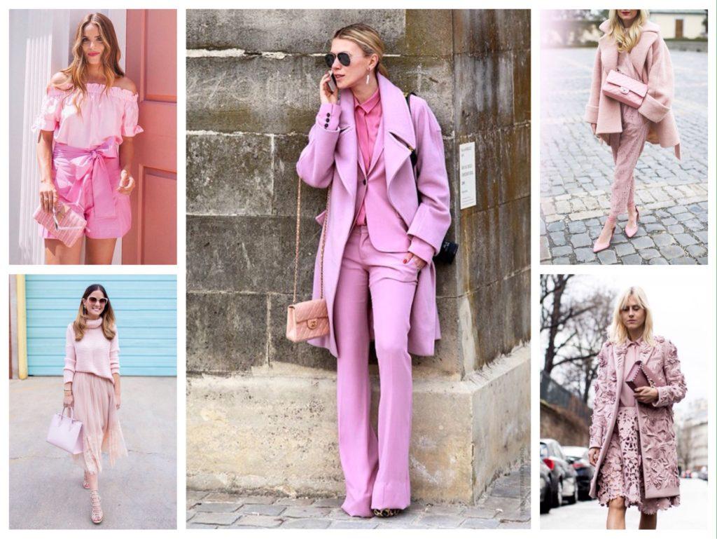 Популярны комплекты пастельных тонов в формате total look. Для создания образа достаточно выбрать вещи, отличающиеся на несколько тонов. Например, легкое платье телесного оттенка с карминовым пиджаком и пудровой сумочкой.