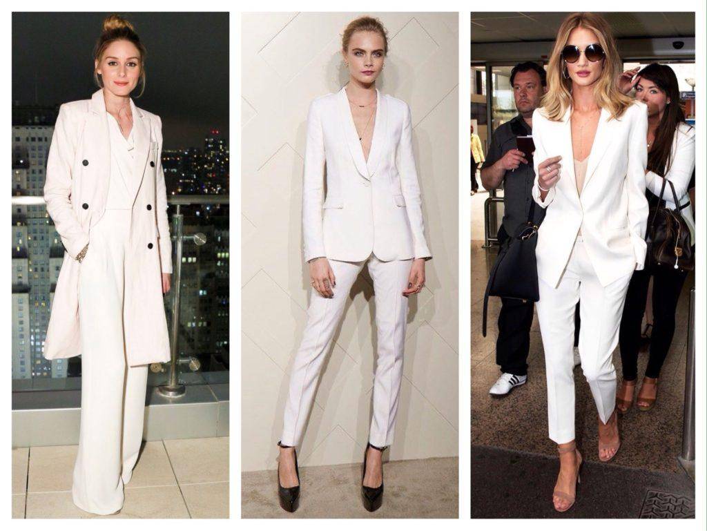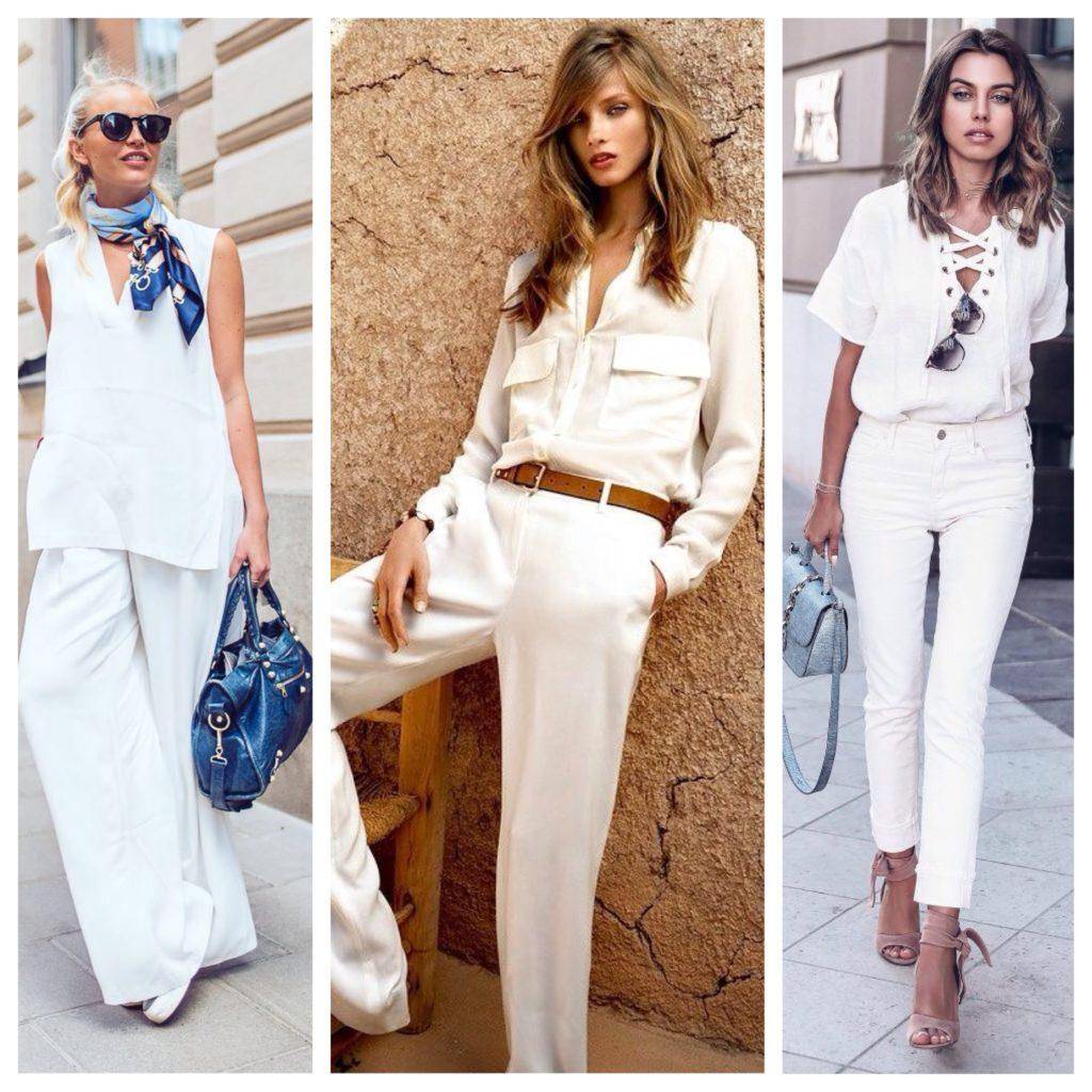 Белоснежный total look способен сделать любую девушку изысканной, приковывая к ней внимание окружающий. Разбавить образ помогут яркие аксессуары, такие как обувь или сумка желтого, красного или голубого цвета