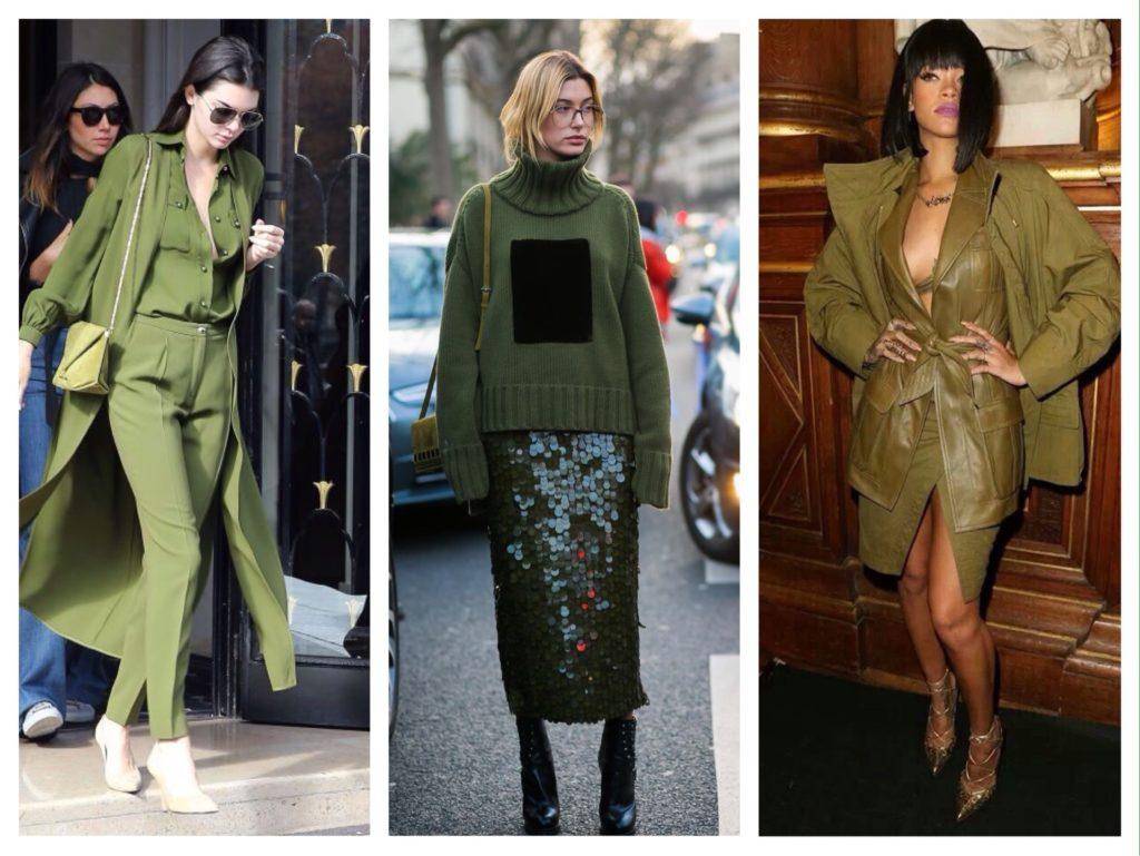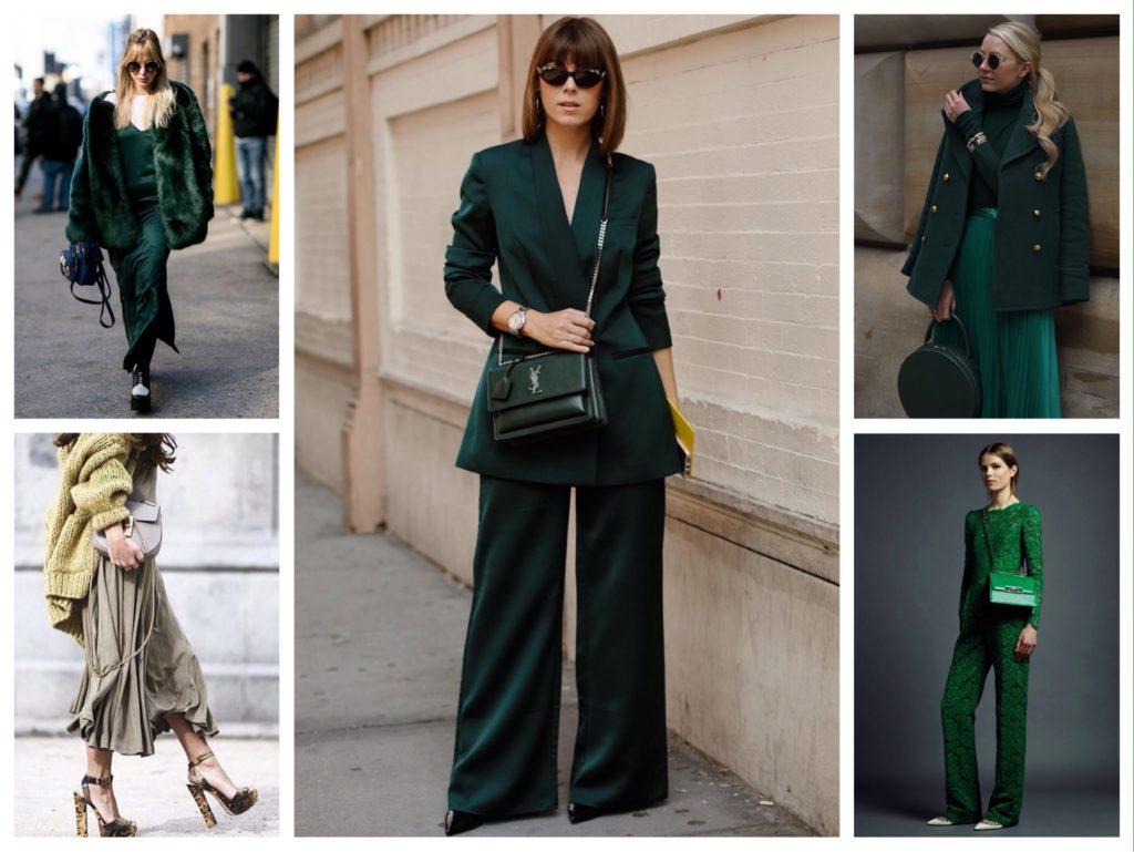 Интересные аутфиты в зеленой гамме: как исполнение с брюками, так и с юбками.