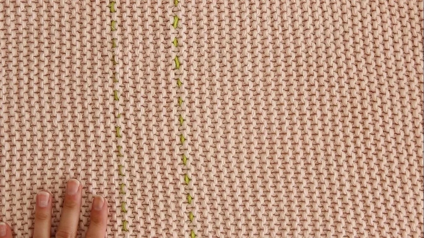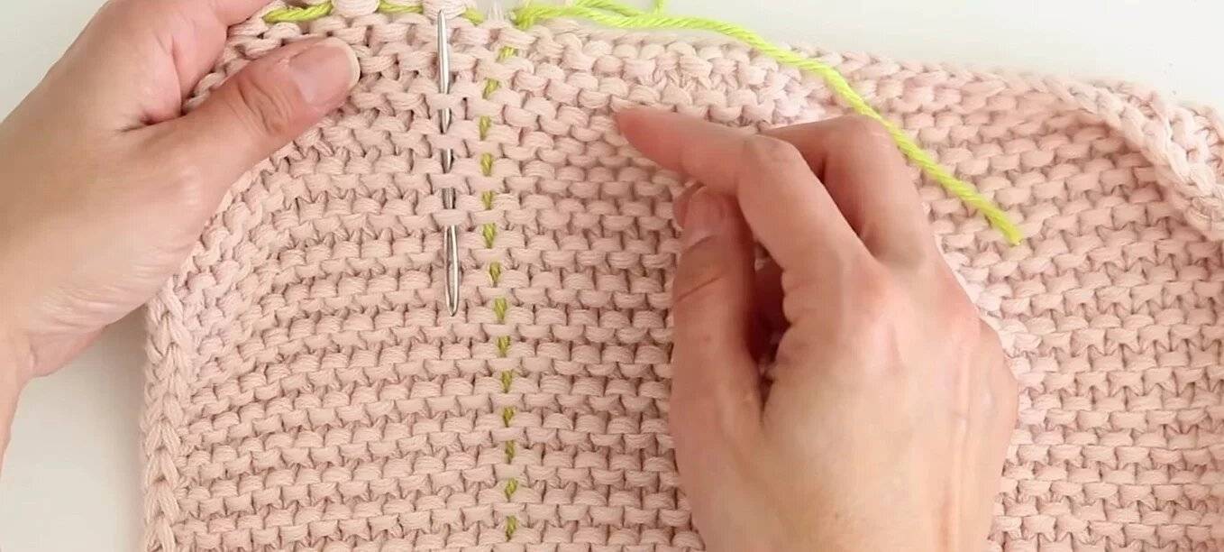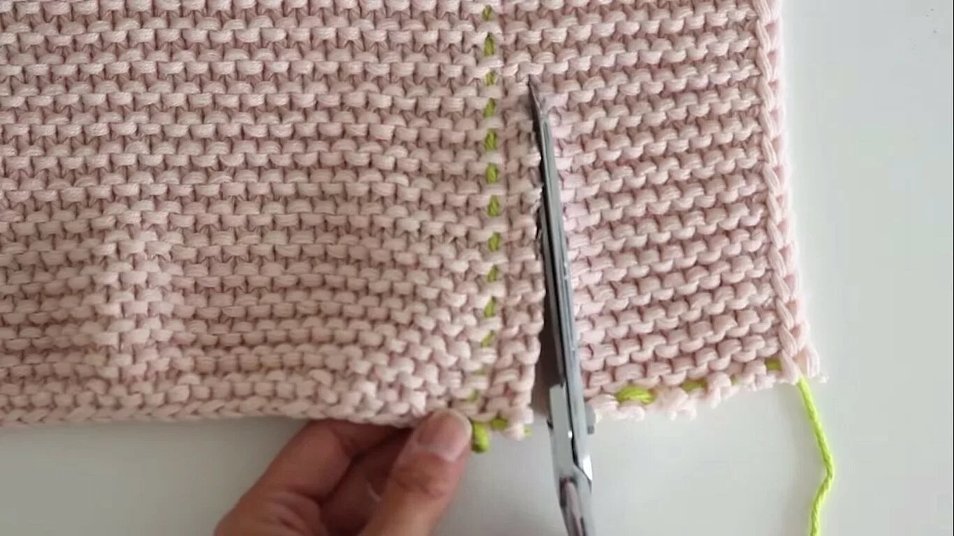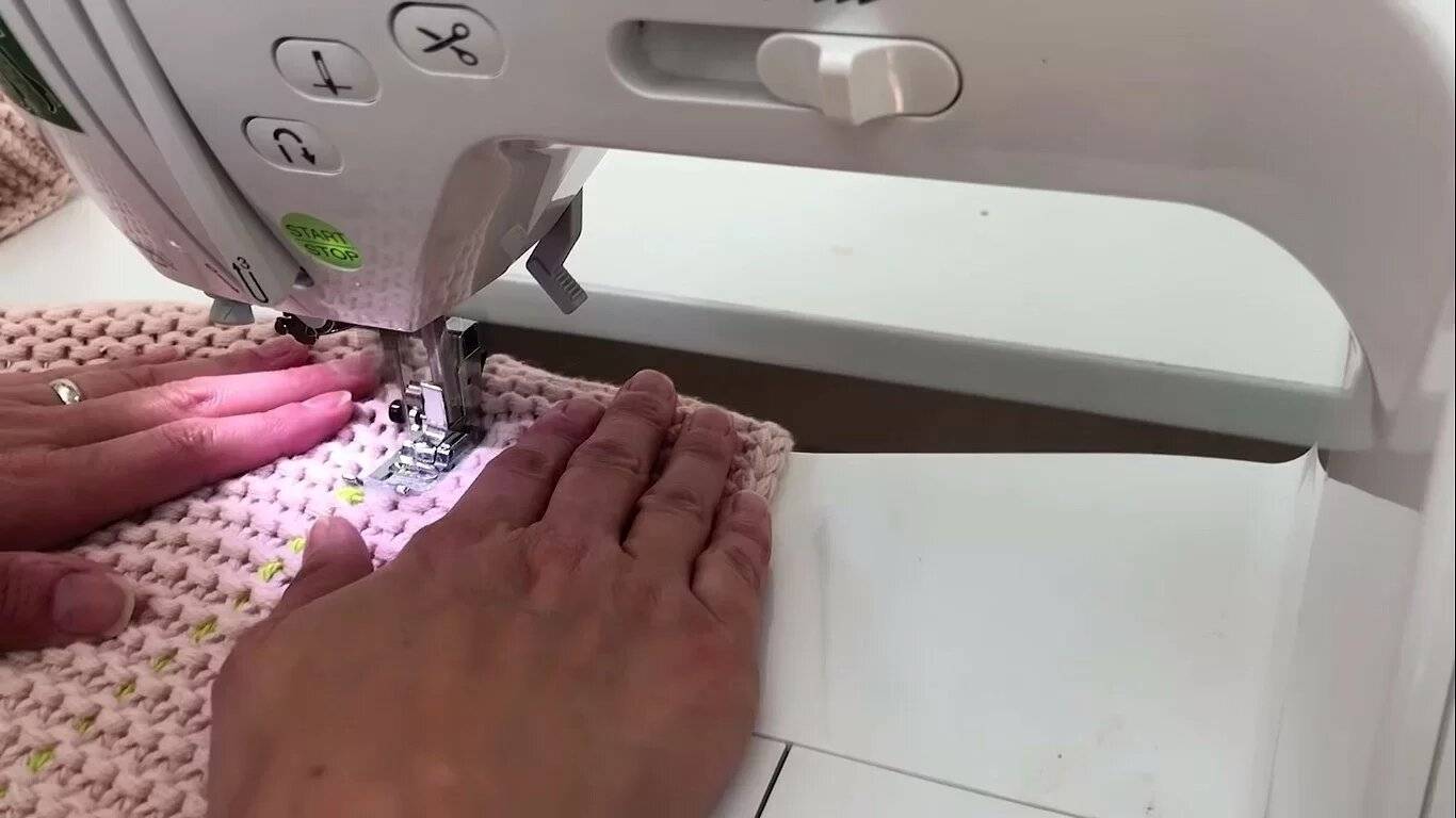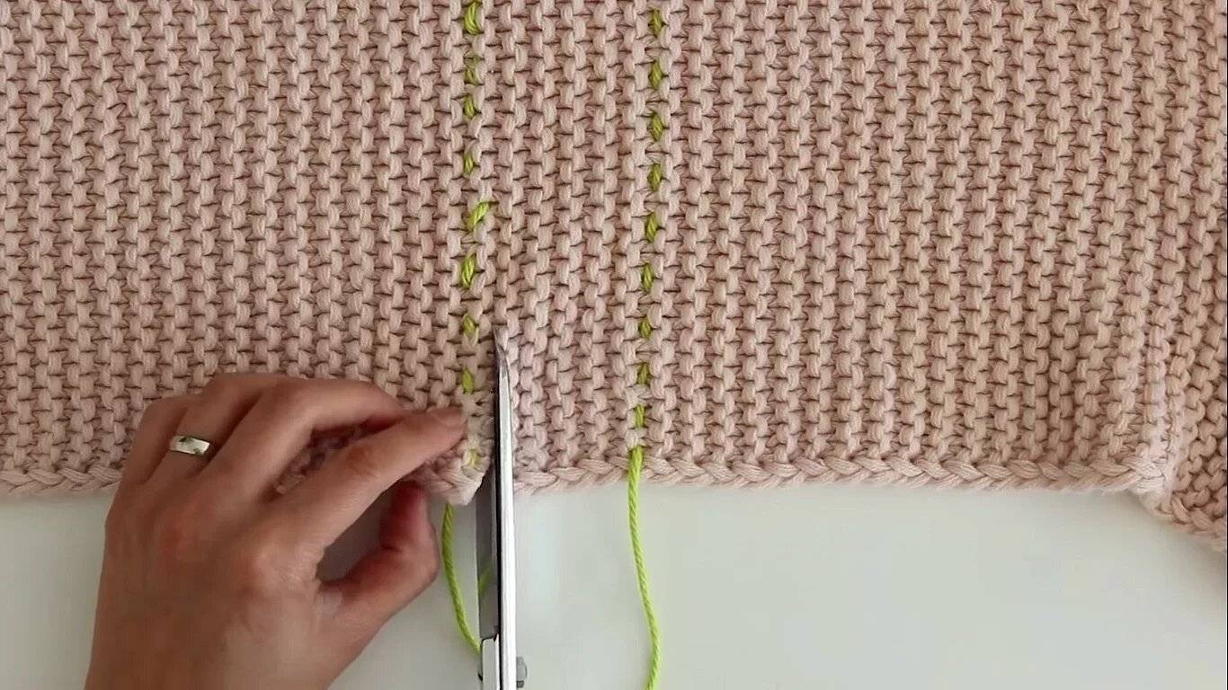 Сначала в 3 см (или двух петлях) от будущего среза вставляет нитку для вязания, затем в 2 см (в трех петлях) прошиваем по длине на машинке. Затем отрезаем с помощью ножниц для ткани (см. фото ниже). Отверните край наизнанку и пришейте. Удалите нитку, которую добавили для разметки.