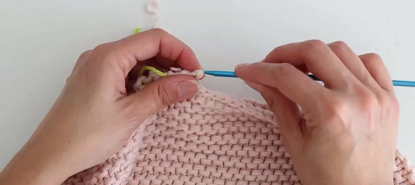 После этого вам нужно обработать края вашего полотна. Для этого сначала обработайте длинные стороны вашего полотна. Сделать это достаточно просто — по краю сначала во все петли проденьте обычную нитку, а затем с помощью крючка и ниток для вязания правильного тона соедините все петельки полотна.