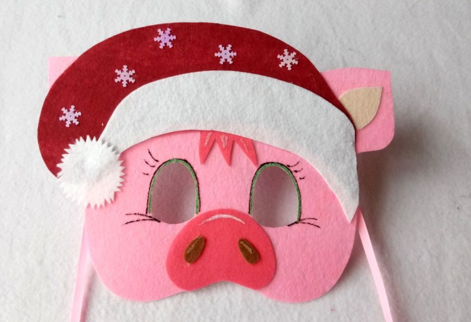 - Вырежьте и пришейте ушки, сделайте задорный пятачок. Возьмите фломастер и нарисуйте ним дырочки на пятачке, а также обведите по контуру отверстия, прорезанные для глаз, чтобы подчеркнуть их. Теперь пришейте ленточки или резиночки для крепления – и мягкая, комфортная маска Поросенка готова.