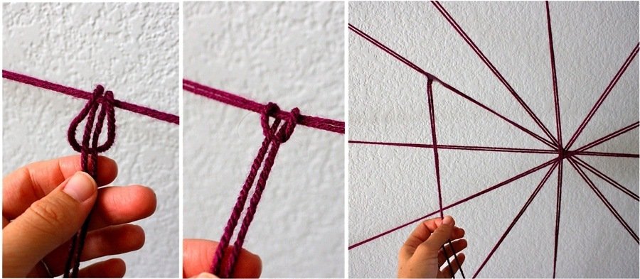 Теперь можно начинать плести нашу паутину. Берем нитку и закрепляем ее с помощью узелка к первой опорной нити. Можно еще использовать и вот такое крепление: