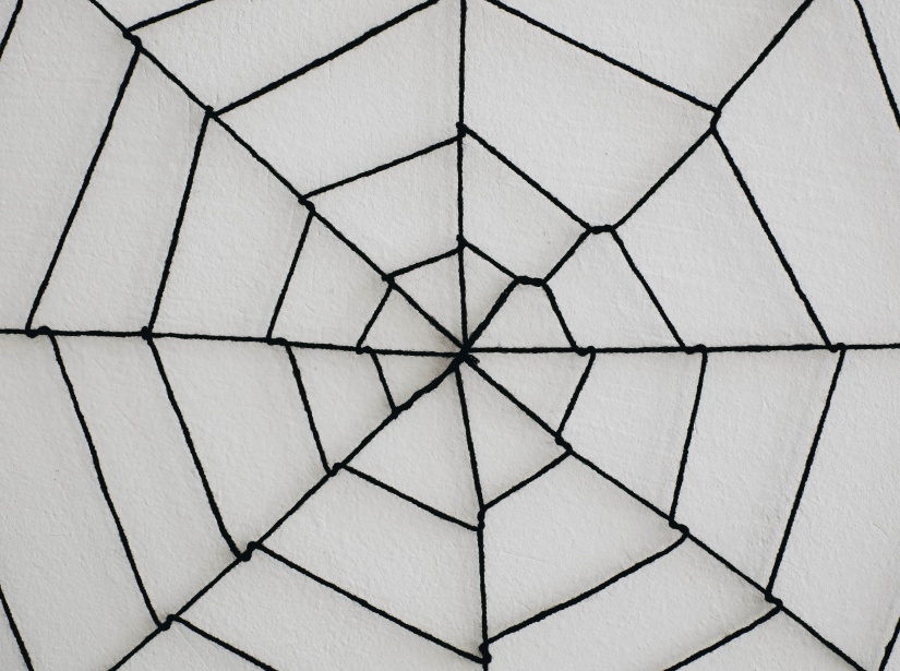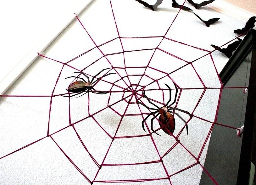 Чтобы изготовить свободно висящую паутинку, в любом подходящем месте вбивают шесть-десять гвоздиков, на которые натягивают капроновые нитки или веревку. К одной из них привязывают длинную нить, которую поочередно обвязывают вокруг каждой из нитей основы. Когда образуется круг, нитку обрезают и делают еще несколько кругов. На готовую конструкцию приклеивают пауков, пластиковые, будто бы отрезанные пальцы, скелетов и др. Как вариант – плести можно не каждый круг по отдельности, а одной ниткой по спирали, до самого края.