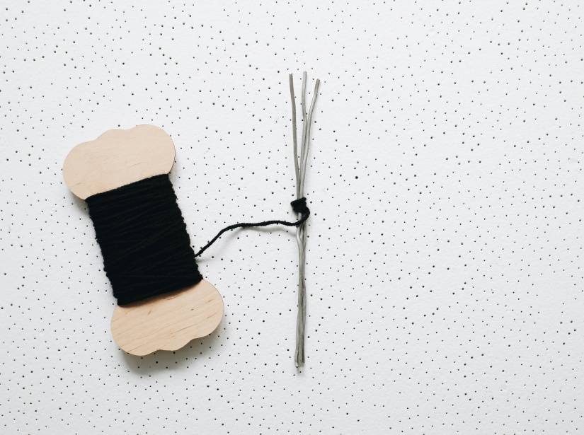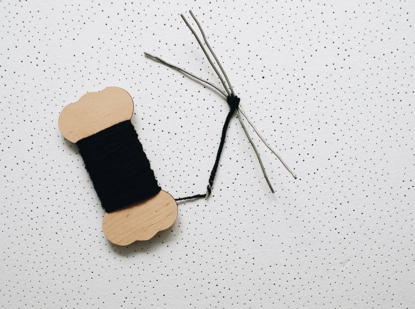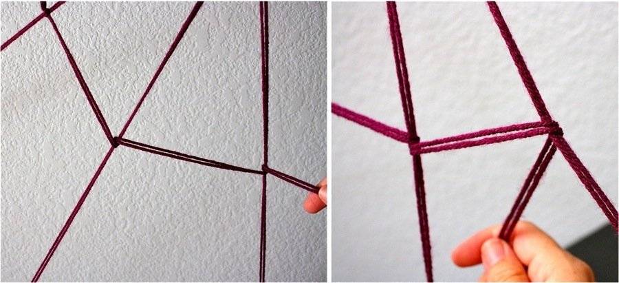 2. Крепим основу к поверхности. В зависимости от отделки стен, нити можно зафиксировать при помощи портновских булавок или двухстороннего скотча. Главное — не испортить покрытие.