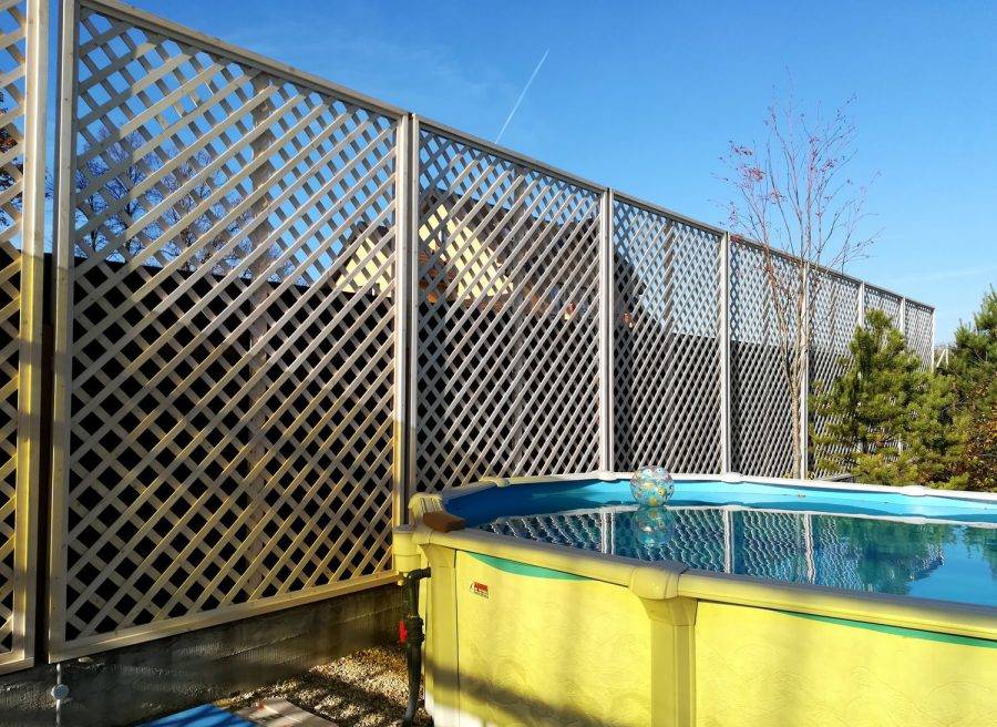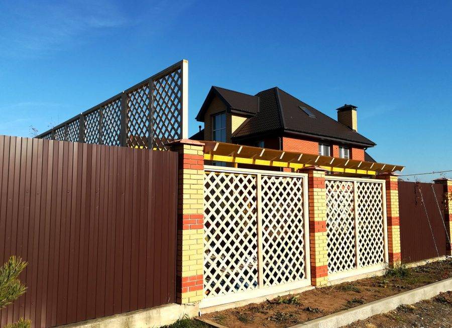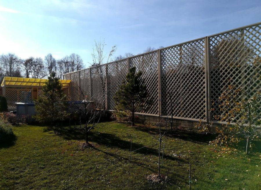 В завершение строительства вверху и внизу прикрепляют поперечные доски к боковым столбам. Затем устанавливают шпалеры или выполняют решетку. Расстояние установки перекладин от верхних балок и поверхности земли будет зависеть от размера и формы решетки или шпалера.