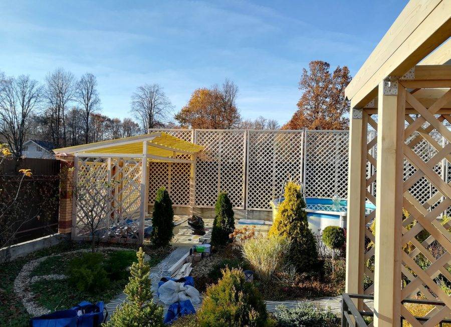 - Затем по бокам перголы, между столбами, устанавливается решетка (могут быть рейки из дерева, оцинкованные винты).