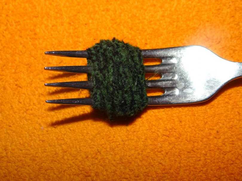 Если нужно сделать много маленьких помпончиков из тонкой пряжи, лучше всего использовать вилку. Для этого на зубчики намотать нитки, перевязать их посерединке и разрезать по краям.