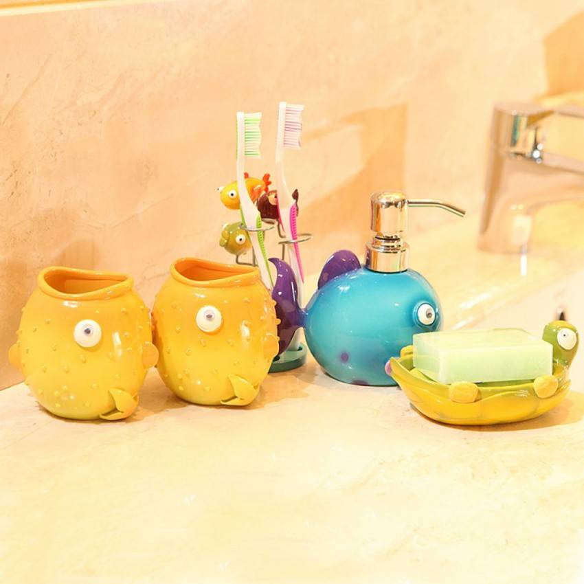 Наборы для детских ванных должны быть выполнены из безопасных материалов. Нельзя допускать, чтобы малыш прищемил себе пальчики мыльницей или футляром для зубной щетки, поэтому выбирать следует те, что выполнены из мягкого пластика.