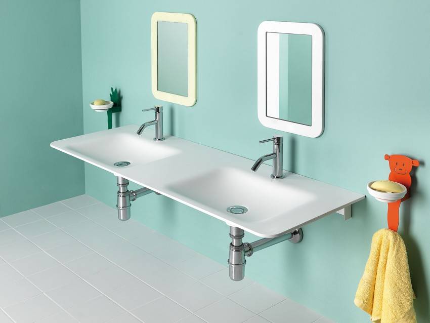 Если дети имеют разный рост, необязательно устанавливать две раковины на разной высоте. Достаточно для малыша поставить скамеечку. Также можно повесить каждому свое настенное зеркало на разной высоте, чтобы удобно было и старшему, и младшему.