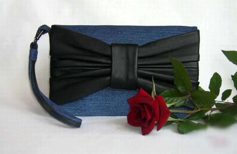 Клатч простой прямоугольной формы из джинсовой ткани с кожаным бантом в качестве декора может быть как нарядным, так и повседневным аксессуаром.