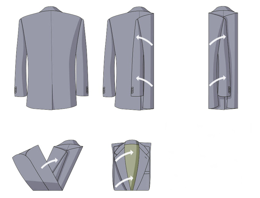 Идеальным вариантом перевозки пиджака (жакета, куртки) является специальный мешок для хранения одежды. Если чемодан довольно большой и, с учетом вещей, достаточно свободный внутри, то костюм можно поместить на вешалке, сложив его вдвое. При ограниченном свободном пространстве багажа и для большей компактности, есть несколько несложных способов сложить пиджак в чемодан правильно, чтобы он практически не помялся за время поездки.