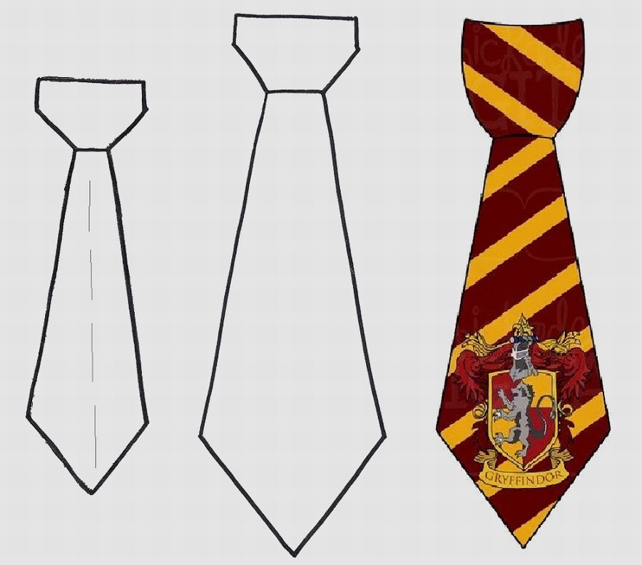Вот выкройка мужского галстука. Дело мастера, из какого цвета ткани он собирается выкраивать галстук. Размеры могут быть произвольными. Совсем уж шикарным вариантом будет украсить галстук эмблемой Хогвартса или гербом Грифиндор и какая там еще есть атрибутика. Для Хэллоуина самое то.