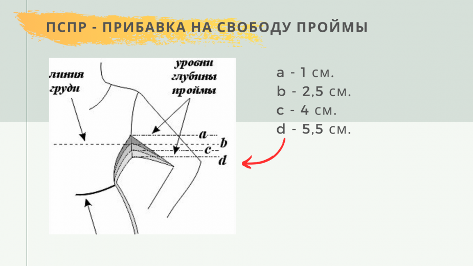- Пспр — прибавка на свободу проймы — 2,5 см.